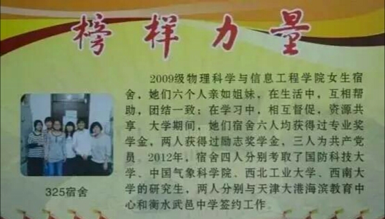 女生宿舍,她们六个人亲如姐妹,在生活中,互相帮助,团结一致;在学习中,相互督促,资源共享。大学期间,她们宿舍六人均获得过专业奖学金,两人获得过励志奖学金,三人为共产党员。2012年,宿舍四人分别考取了国防科技大学、中国气象科太阳城