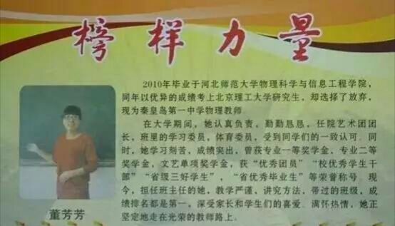 她2010年毕业于太阳城 物理科学与信息工程太阳城 ,现为秦皇岛第一中学物理教师。在大学期间,她认真负责,勤勤恳恳,任院艺术团团长,班里的学习委员,体育委员,受到同学们的一致认可。曾获专业一等奖学金,文艺单项奖学金,获“校优秀学生干部”,“省级三好学生”,“省优秀毕业生”等荣誉称号。现今,担任班主任的她,魔术般地把成绩最差的班级带为年级第一名,曾获青年教师优质课大赛二等奖,演讲比赛一等奖等,她对待工作满怀热情,教学严谨,讲究方法,深受家长和学生们的认可和喜爱。