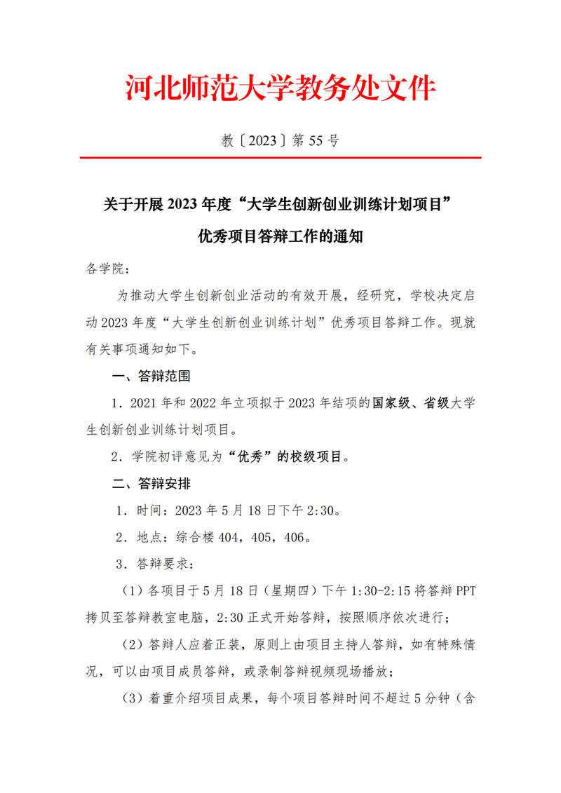关于开展2023年度“大学生创新创业训练计划项目”优秀项目答辩工作的通知