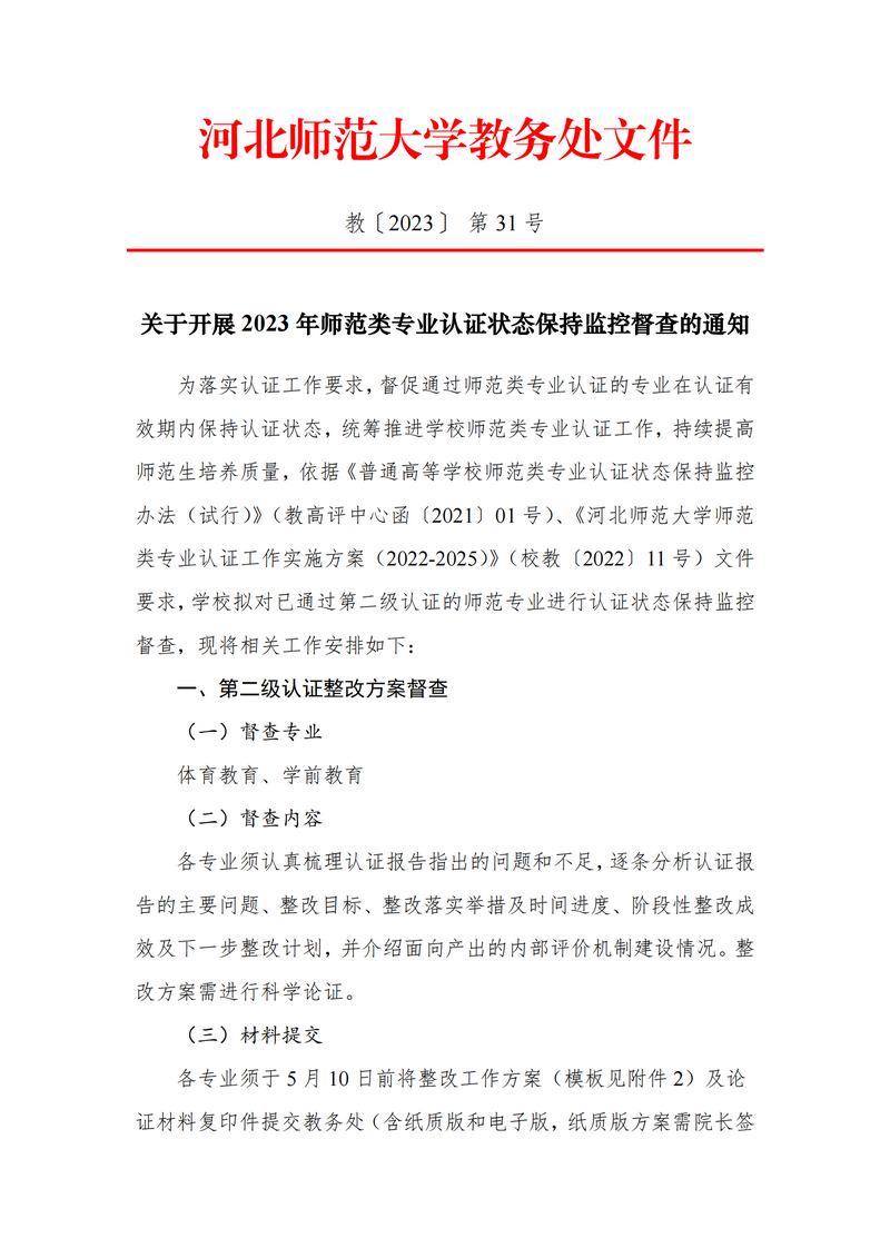 关于开展 2023 年师范类专业认证状态保持监控督查的通知