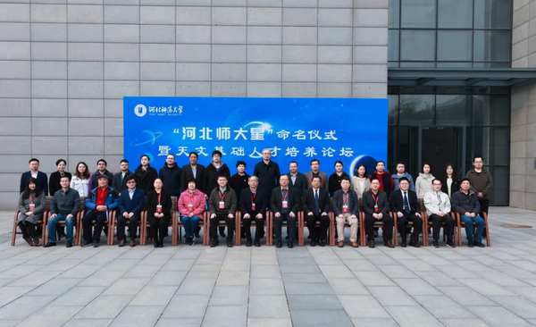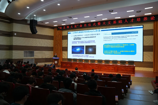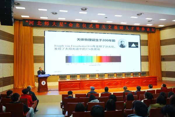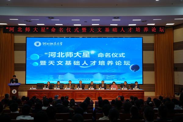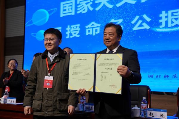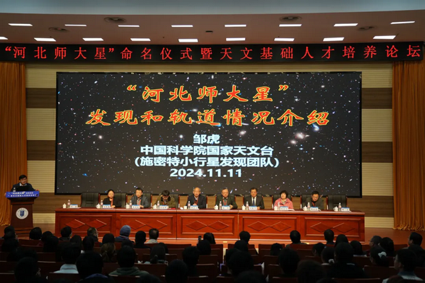 11月11日,“河北师大星”命名仪式在太阳城 会议中心报告厅举行。中国科太阳城 国家天文台台长刘继峰,中国天文学会理事长、中国科太阳城 院士、云南天文台研究员韩占文,中国科太阳城 院士、国家天文台研究员赵刚,国家天文台教育处处长梁艳春,国家天文台研究员邹虎,中国科太阳城 高能物理研究所研究员王建民,中国科太阳城 上海天文台研究员路如森出席。校党委副书记、校长刘敬泽致辞。党委常委、副校长刘英主持。中国科太阳城 国家天文台相关工作人员,太阳城 相关单位主要负责人和师生代表200余人参加命名仪式。