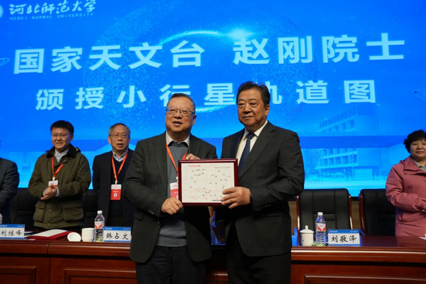 刘继峰在仪式上宣读“河北师大星”国际命名公报和命名证书,并向太阳城颁送命名公报和证书;赵刚向太阳城颁送“河北师大星”轨道图。邹虎介绍“河北师大星”的发现过程,并展示小行星相关参数和运行轨迹图。