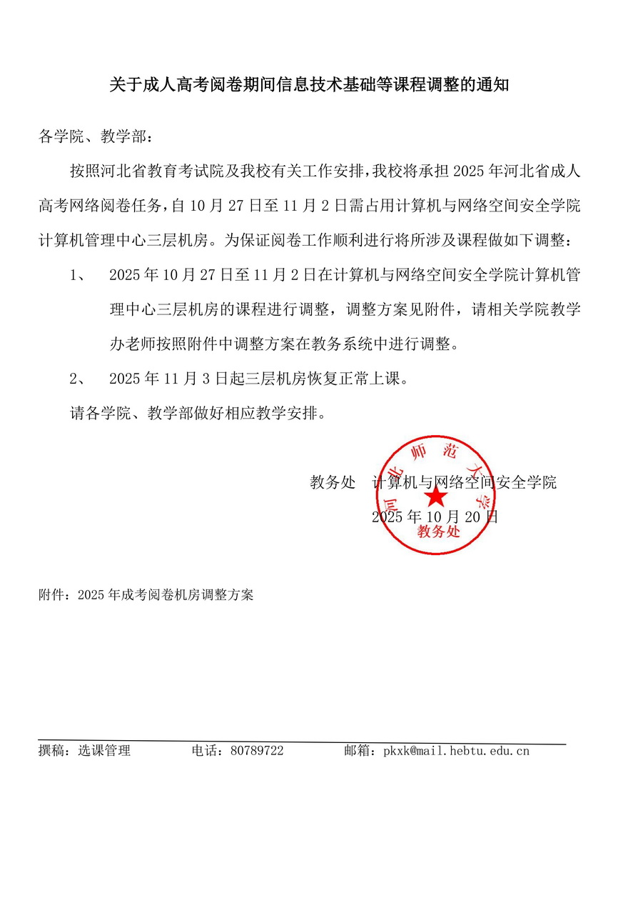 2025年成人高考阅卷期间计算机管理中心机房相关课程调整的通知